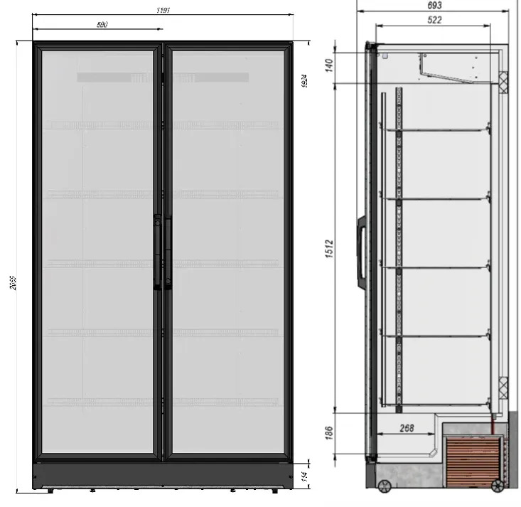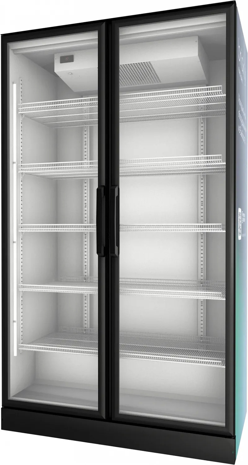 Торговый холодильник со стеклянными распашными дверьми выполнен из крашеного металла, обрамление стеклянных дверей — из алюминиевого профиля.