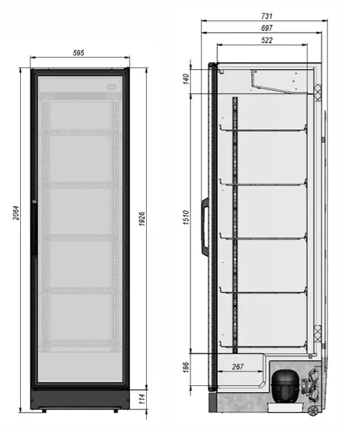 Торговый холодильник со стеклянной распашной дверью выполнен из крашеного металла, обрамление стеклянной двери — из алюминиевого профиля.